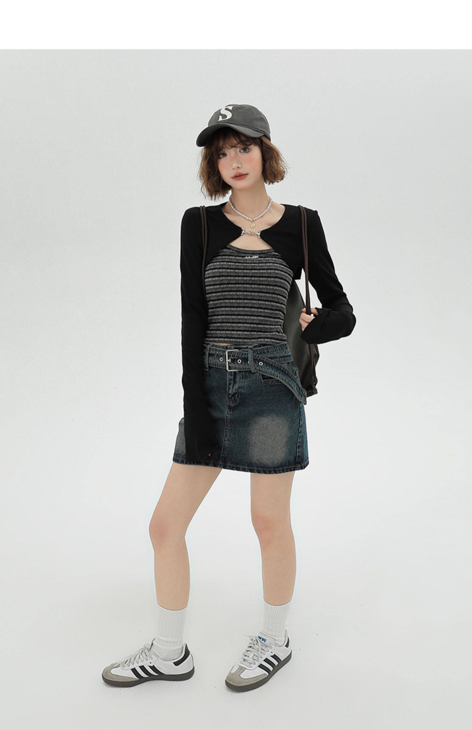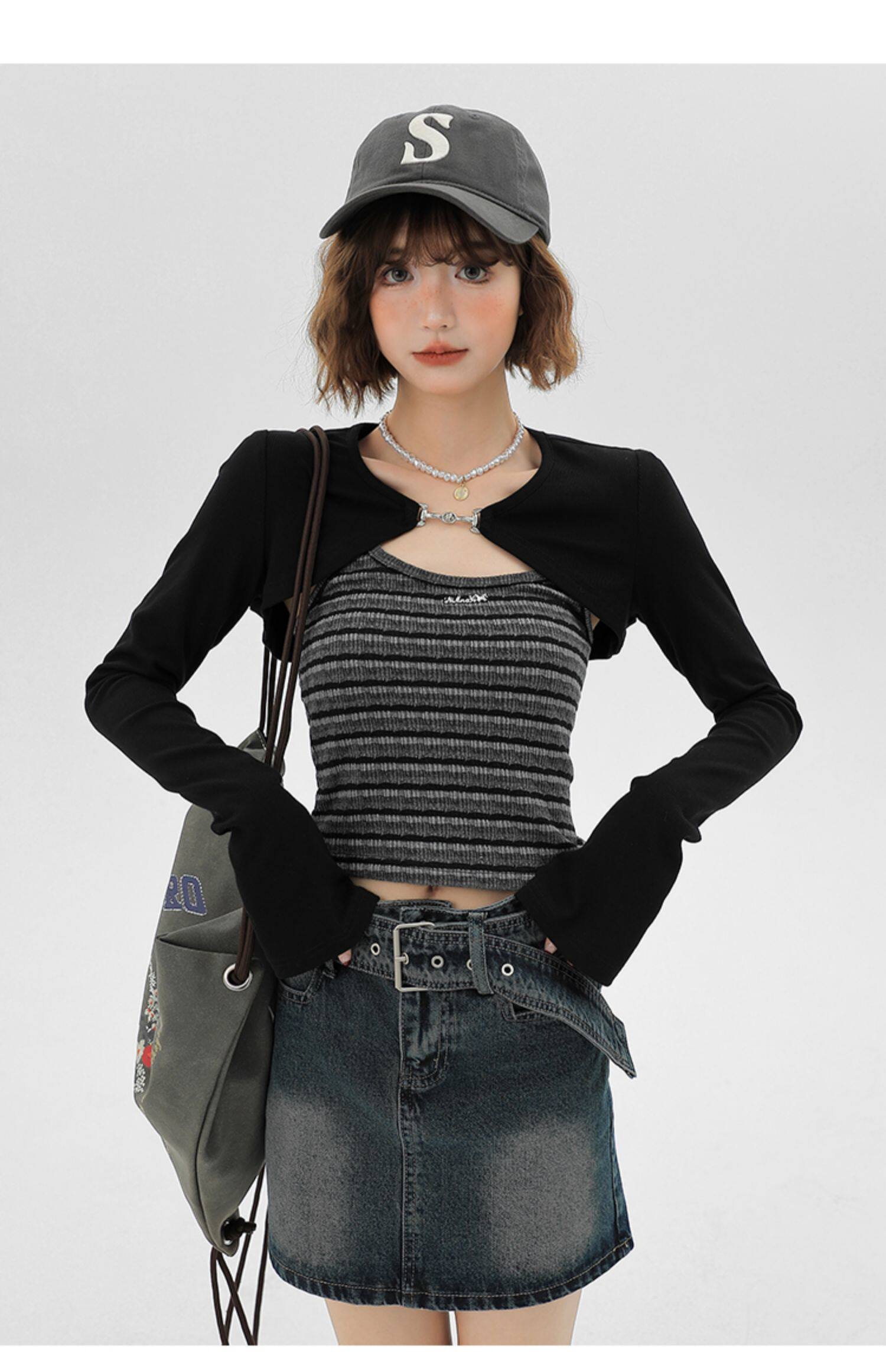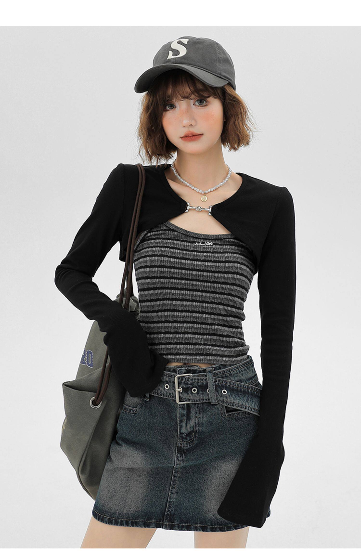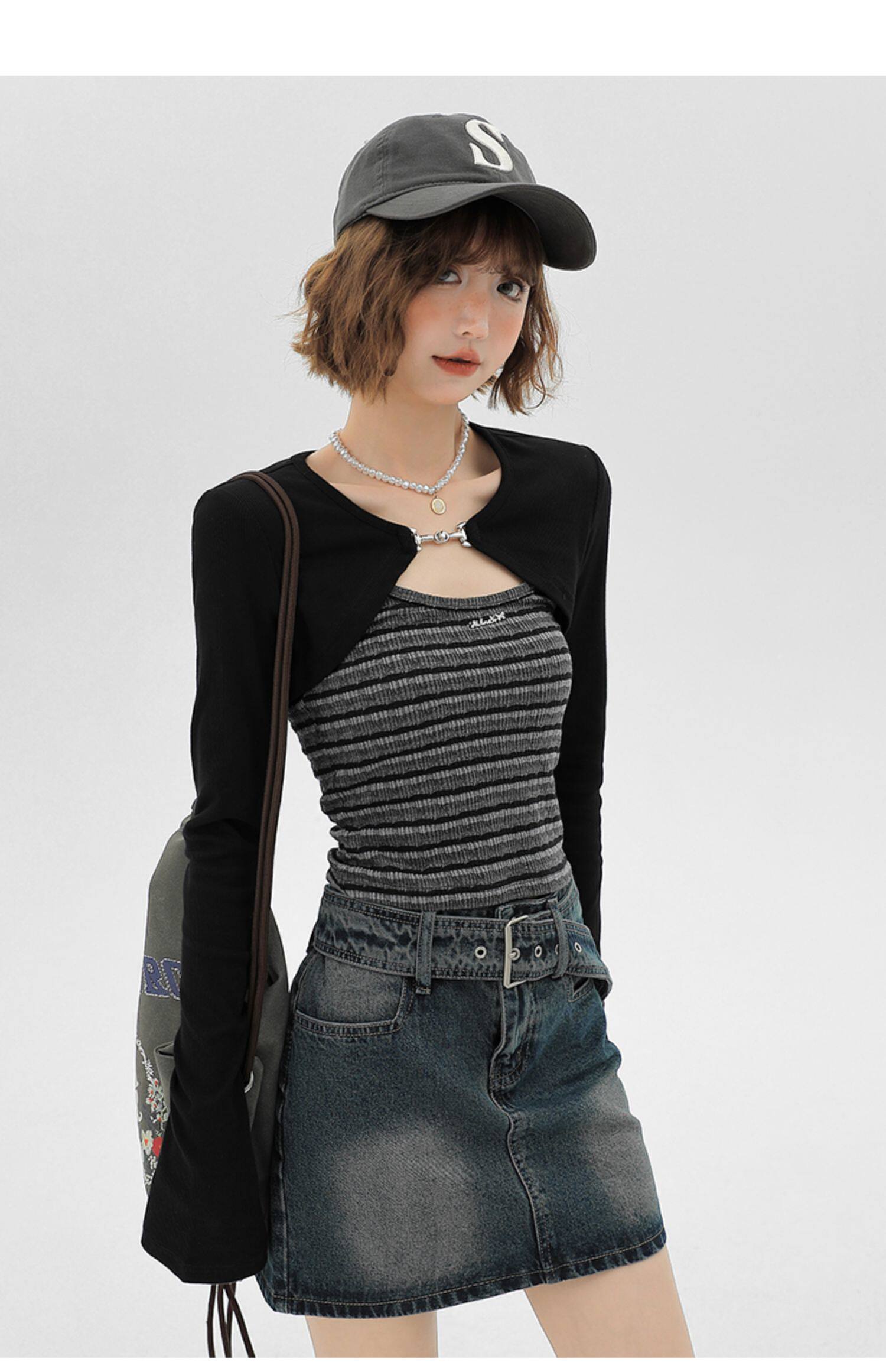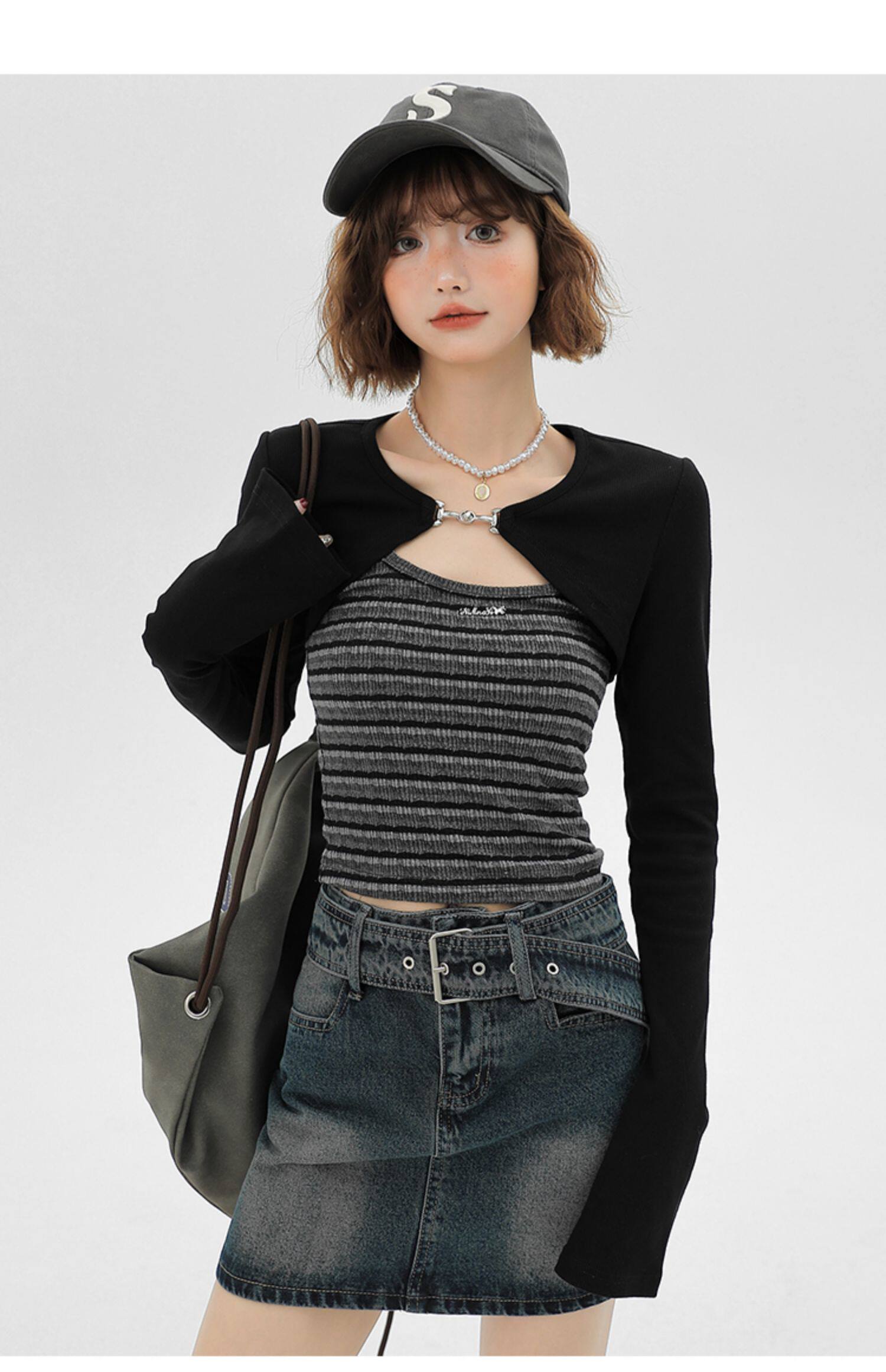 主要颜色: 黑色开衫+条纹吊带衫