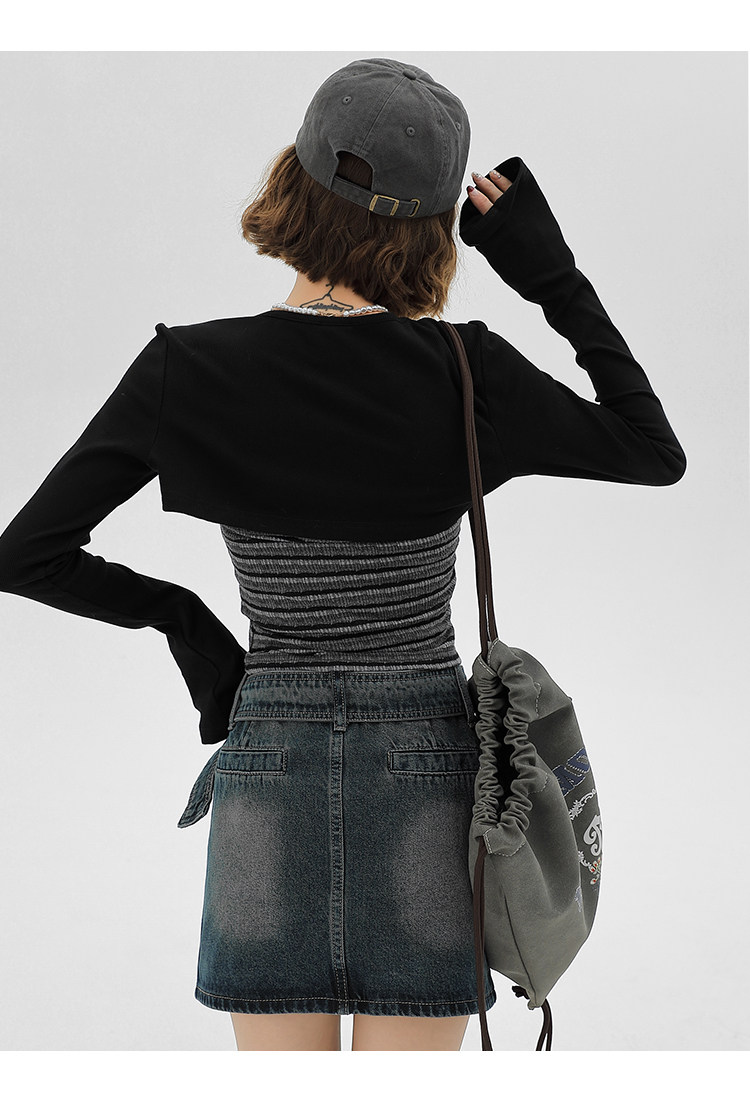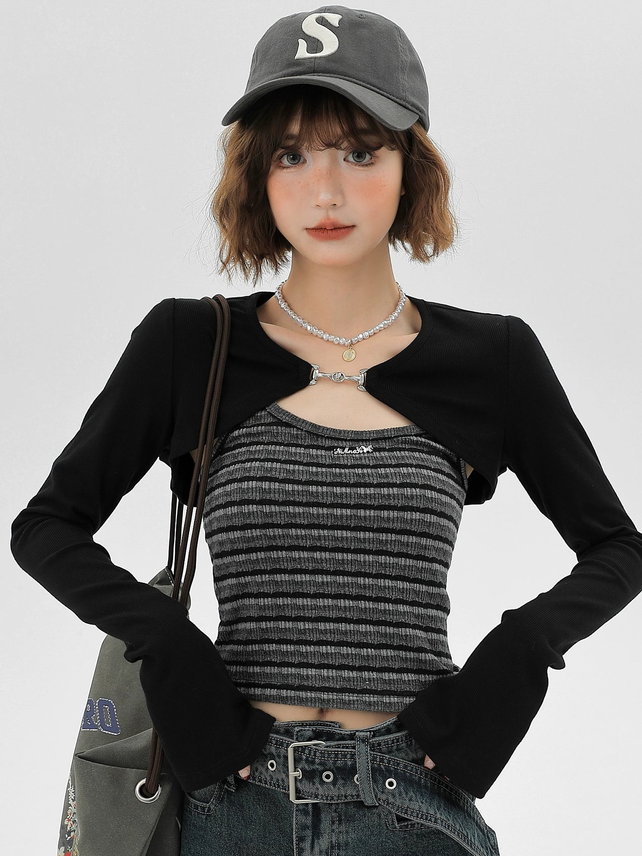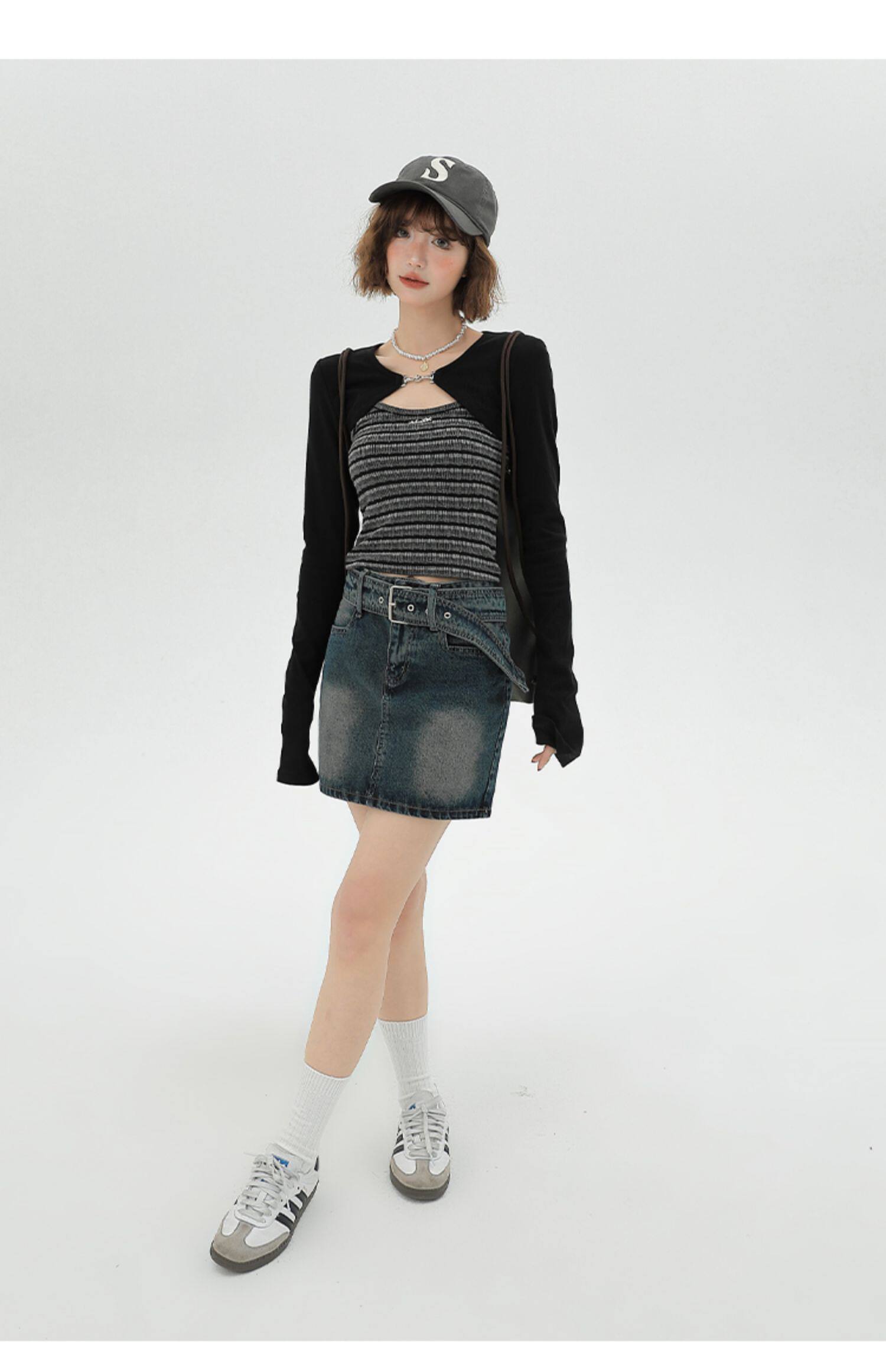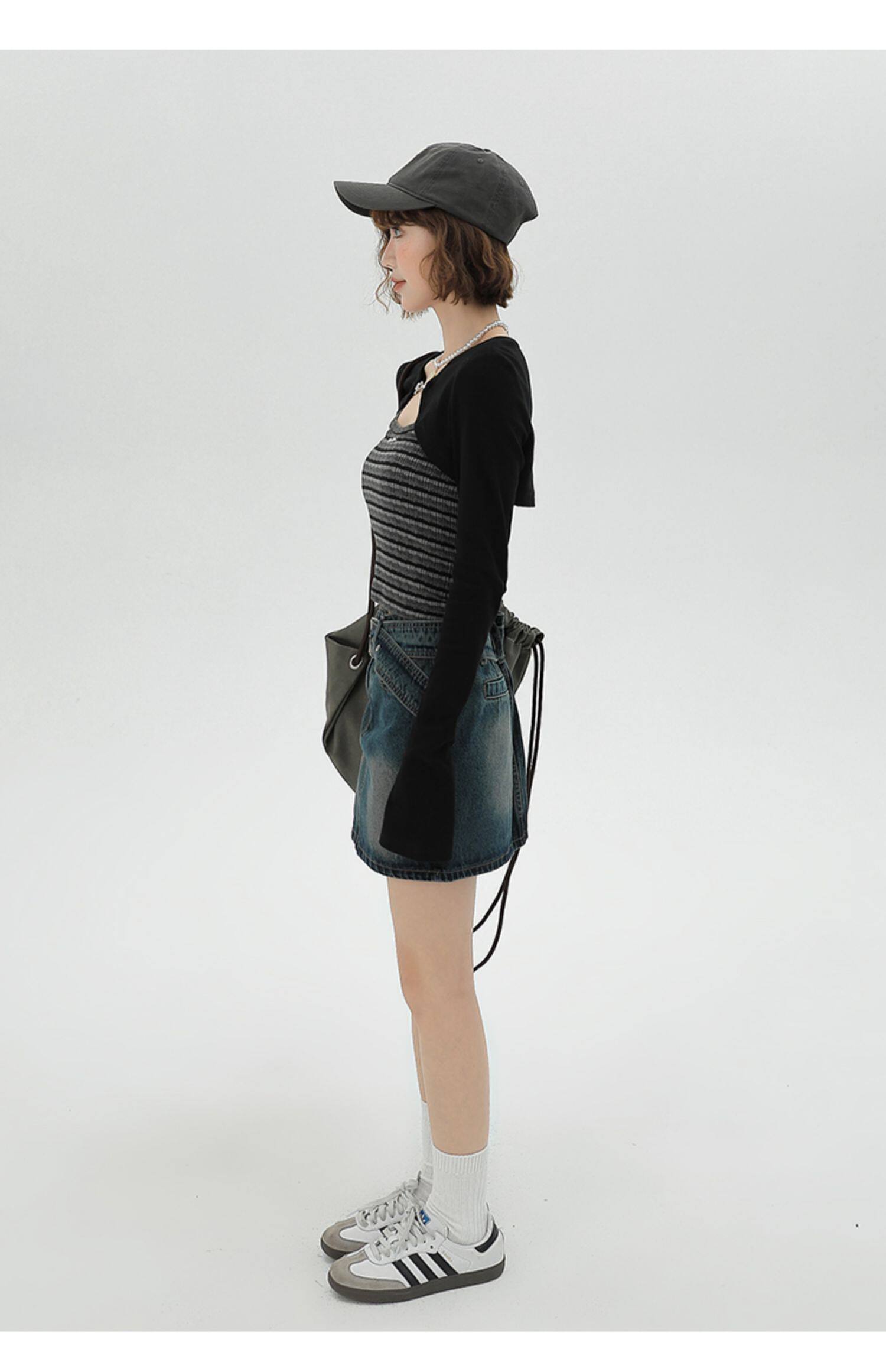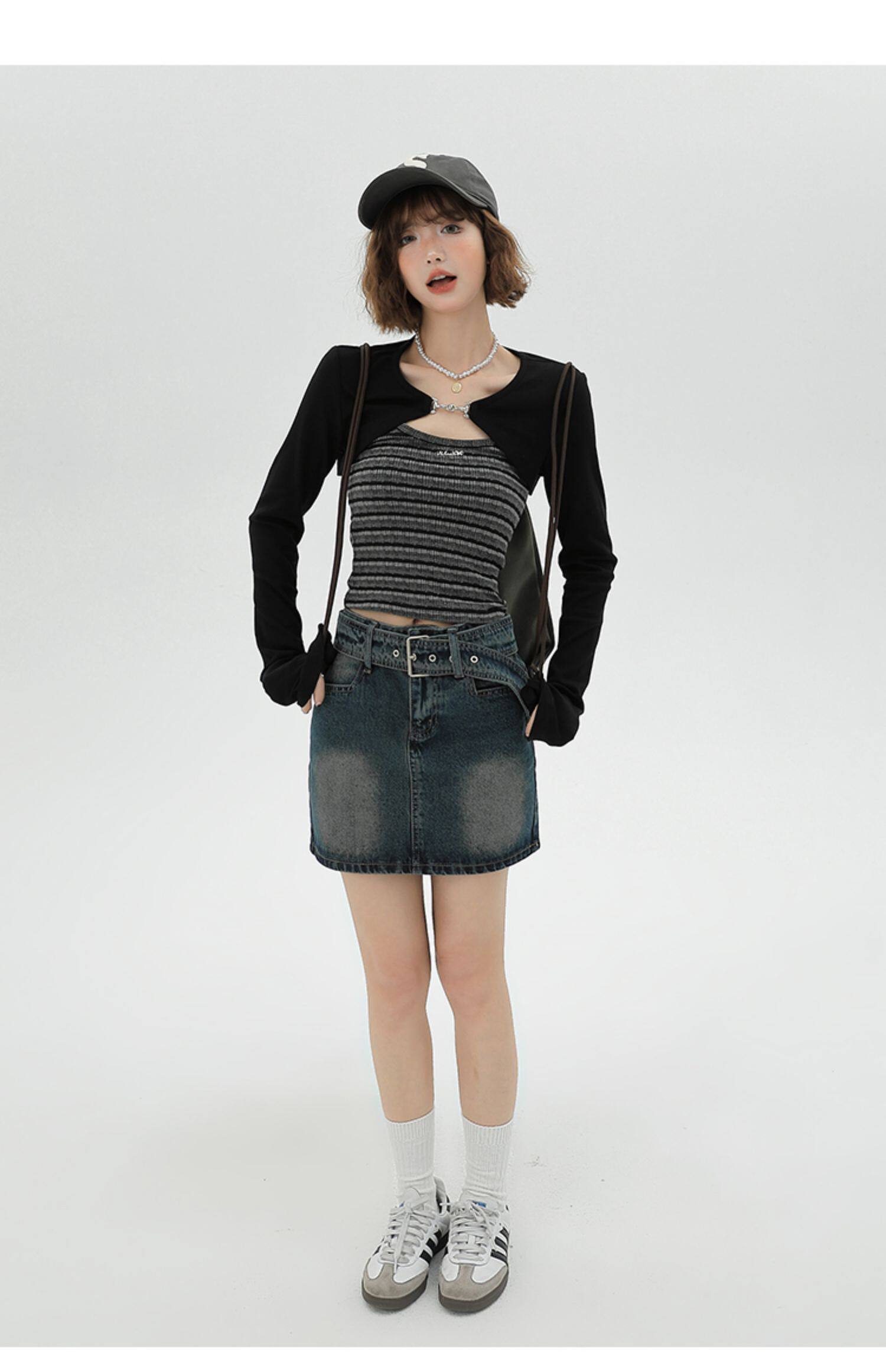 主要颜色: 黑色开衫+条纹吊带衫