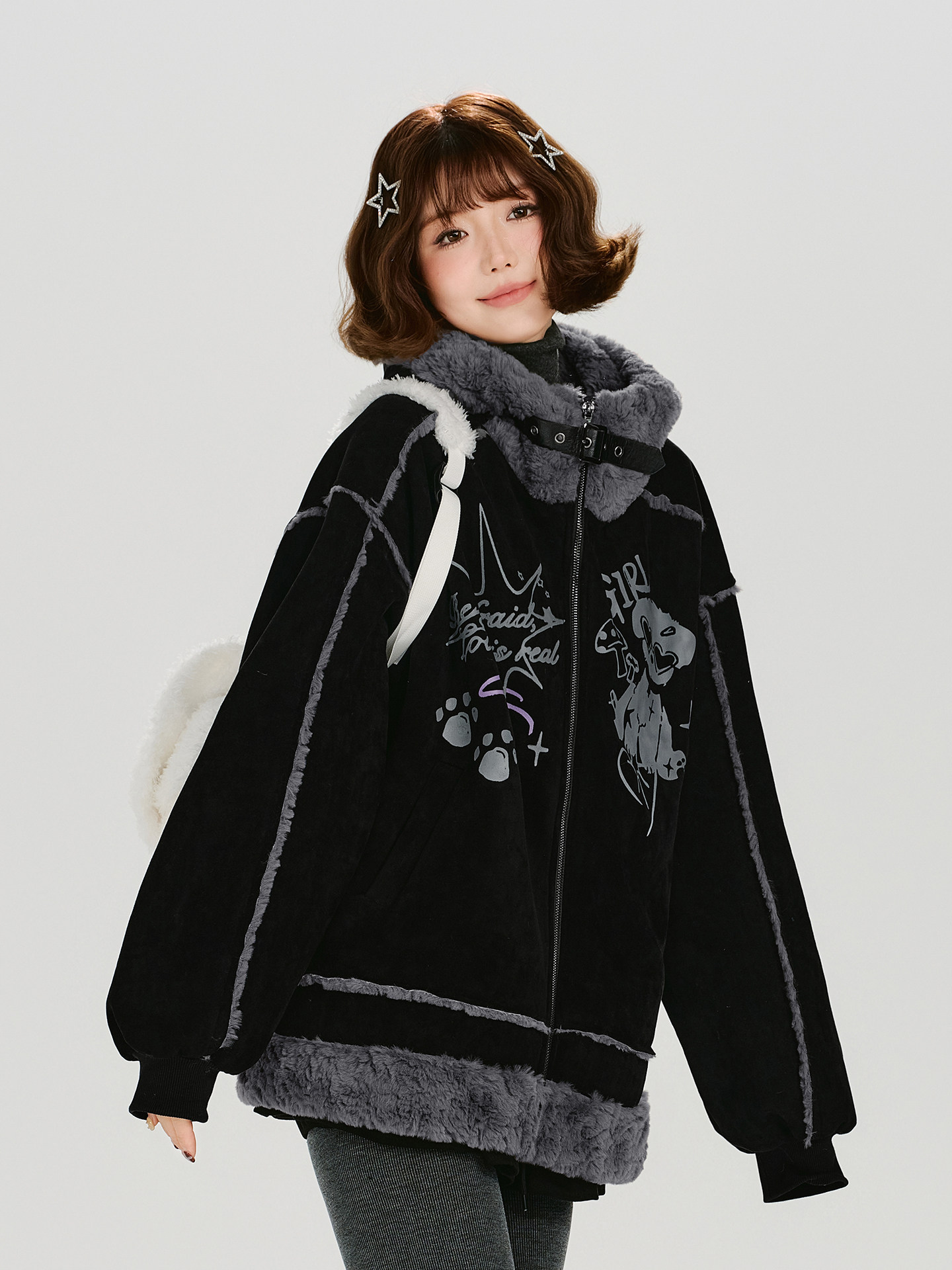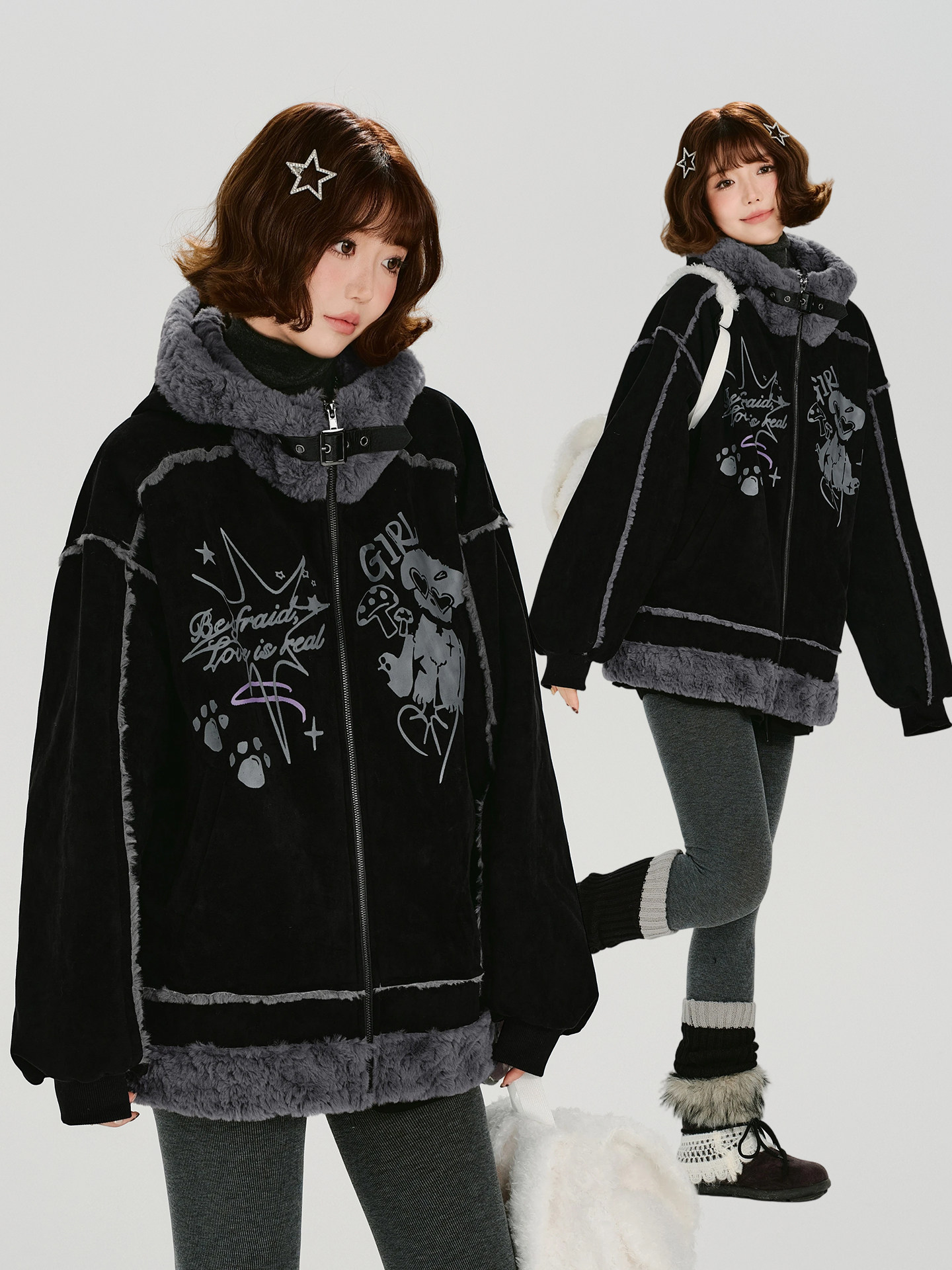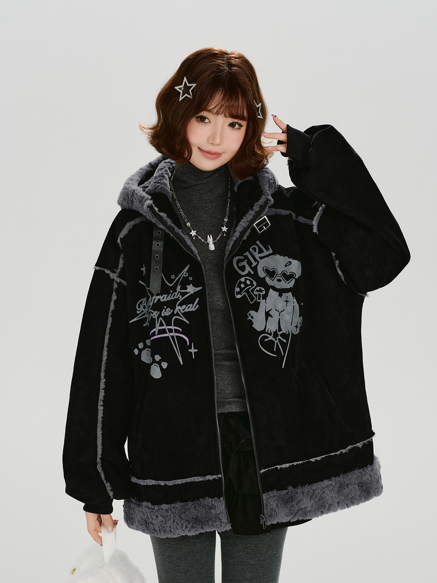 Girlyhalo美式复古印花毛绒麂皮绒外套女冬新款加厚保暖宽松上衣