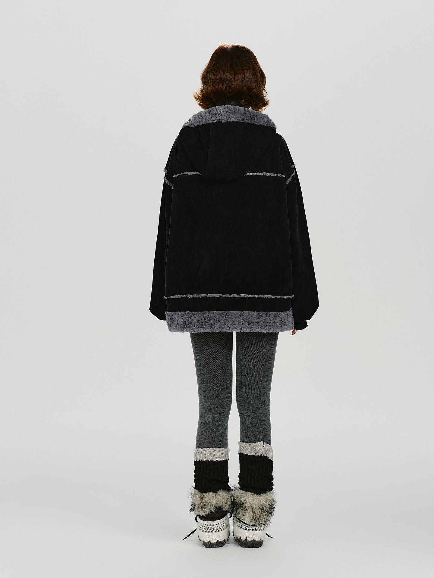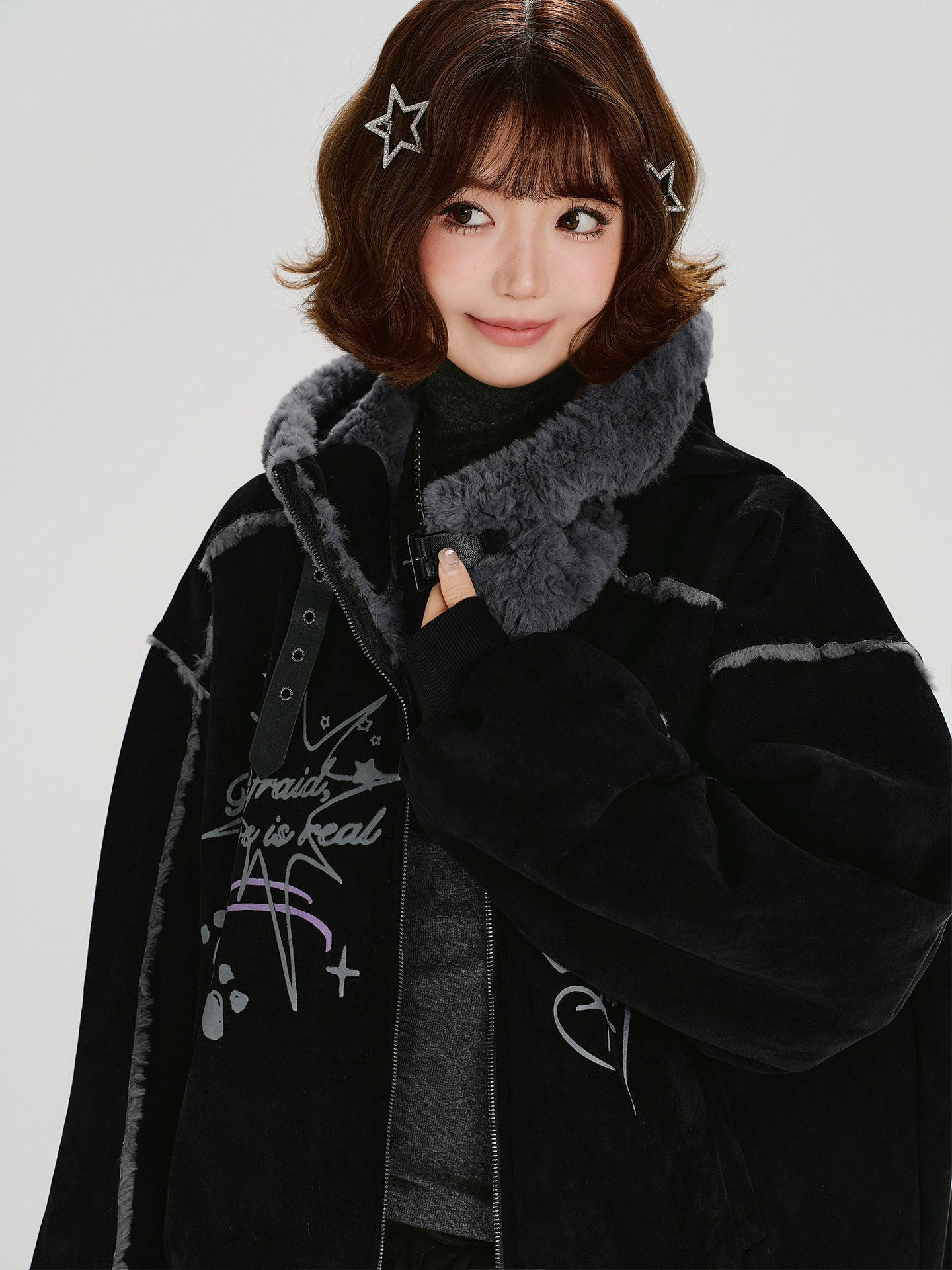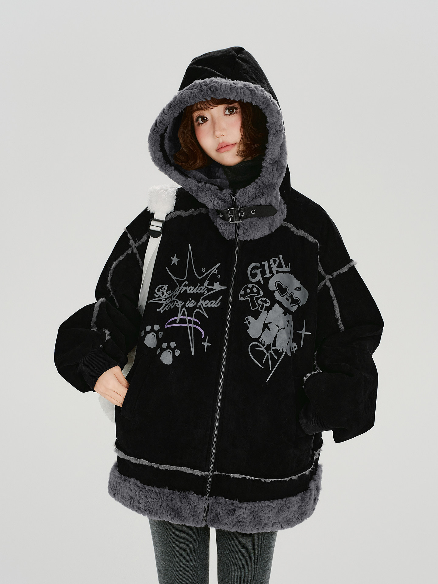 Girlyhalo美式复古印花毛绒麂皮绒外套女冬新款加厚保暖宽松上衣