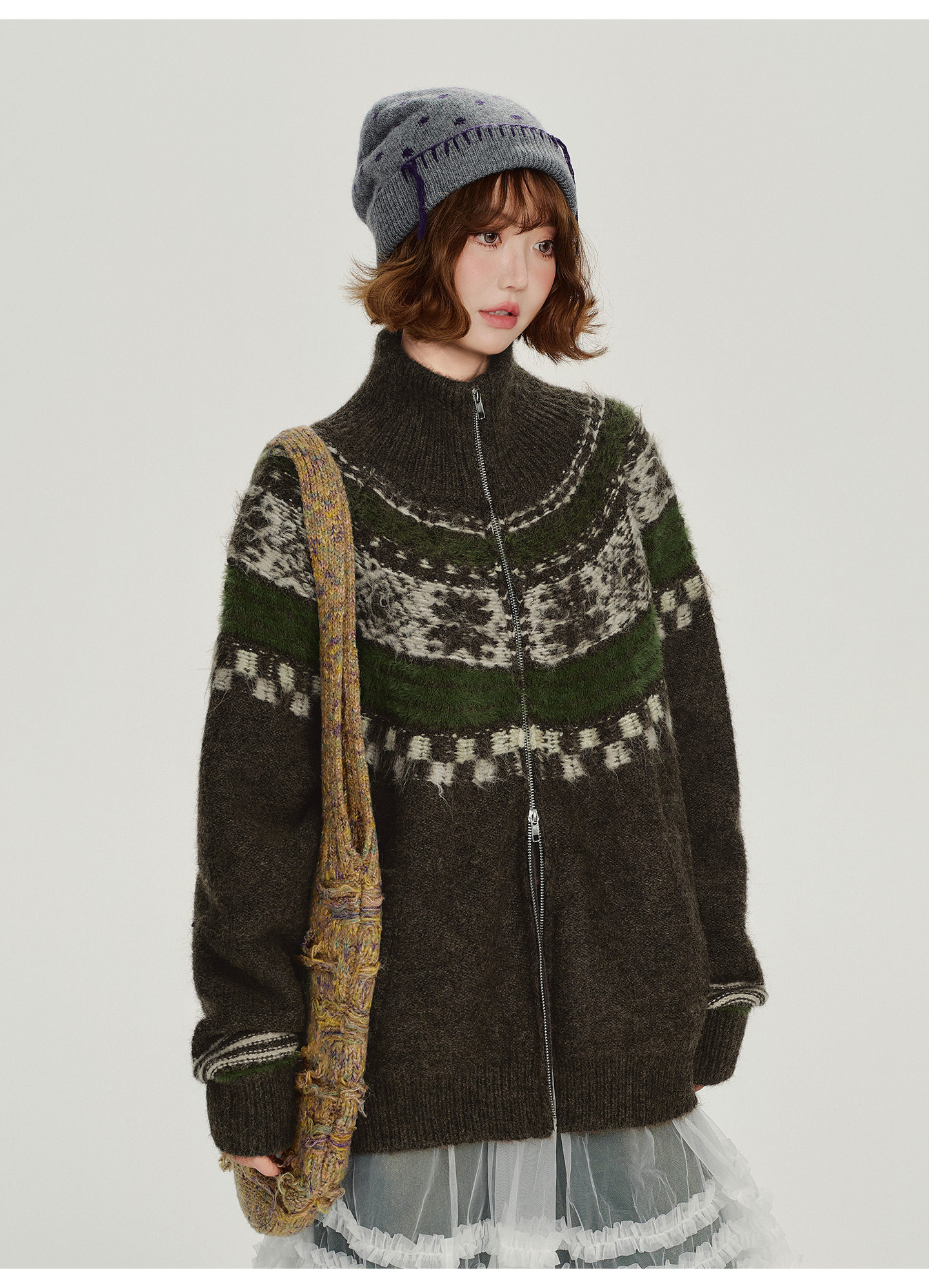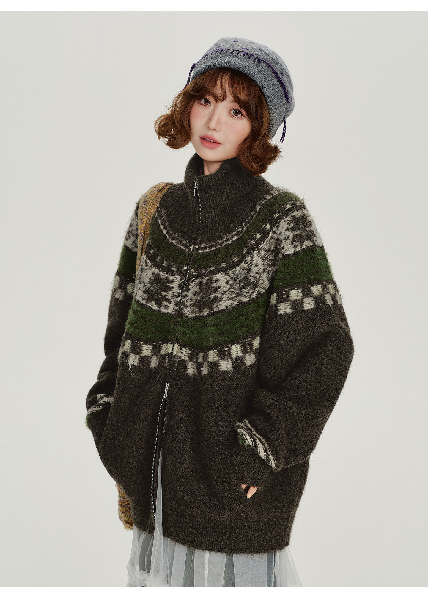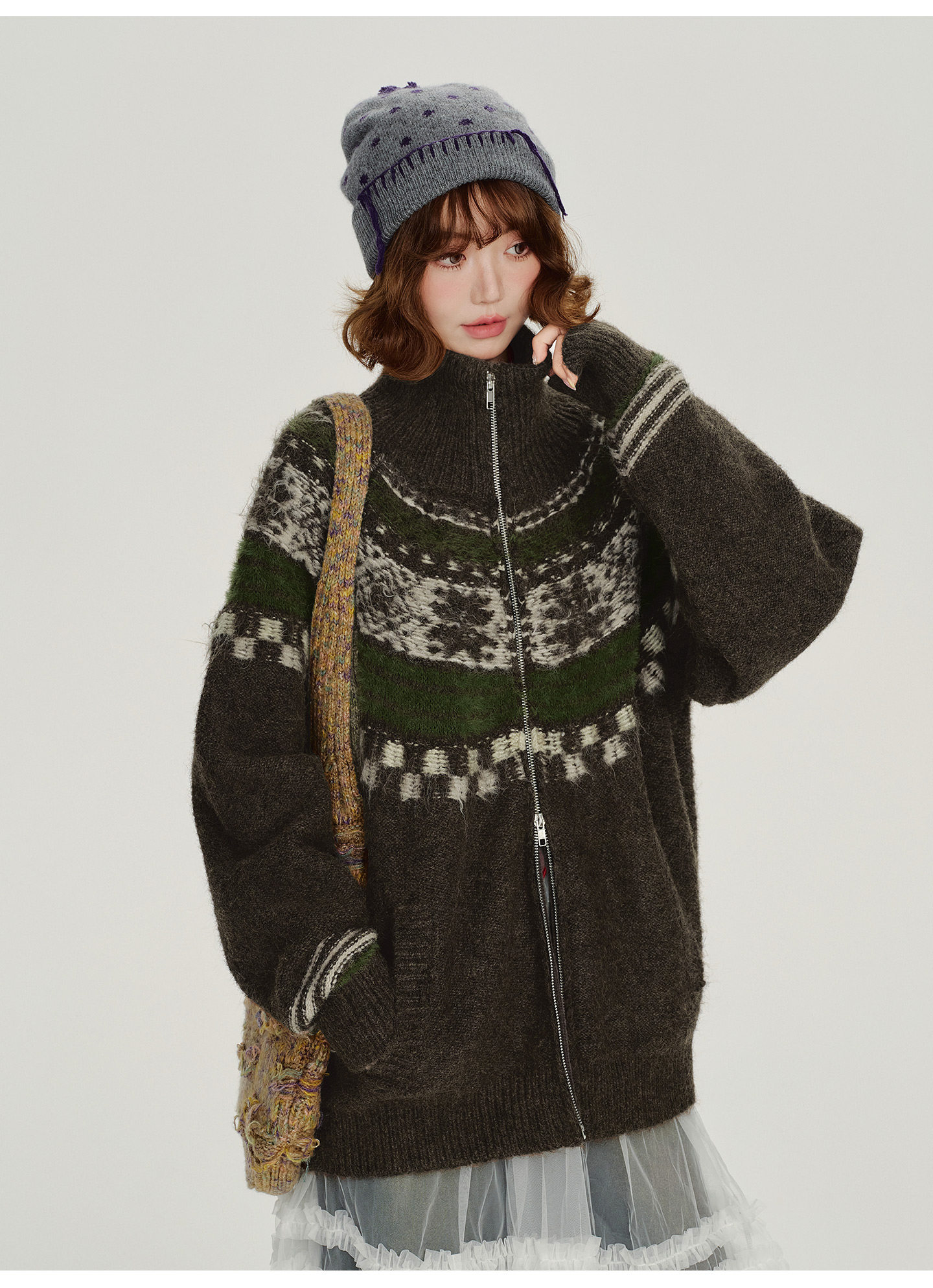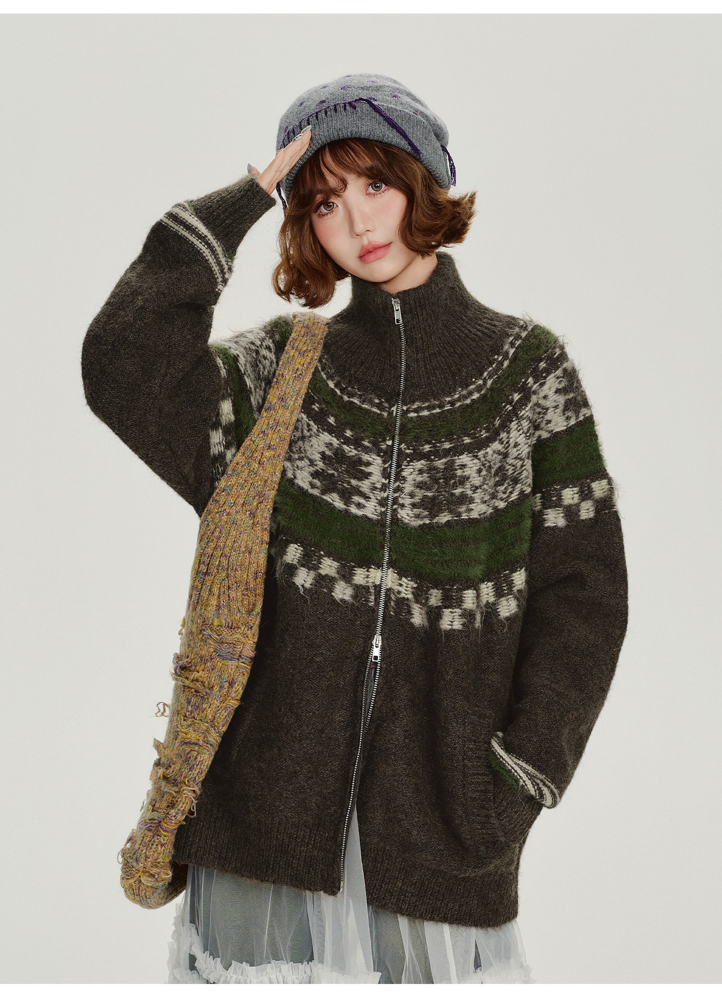 Girlyhalo美式复古费尔岛提花针织外套女冬新款加厚保暖宽松上衣