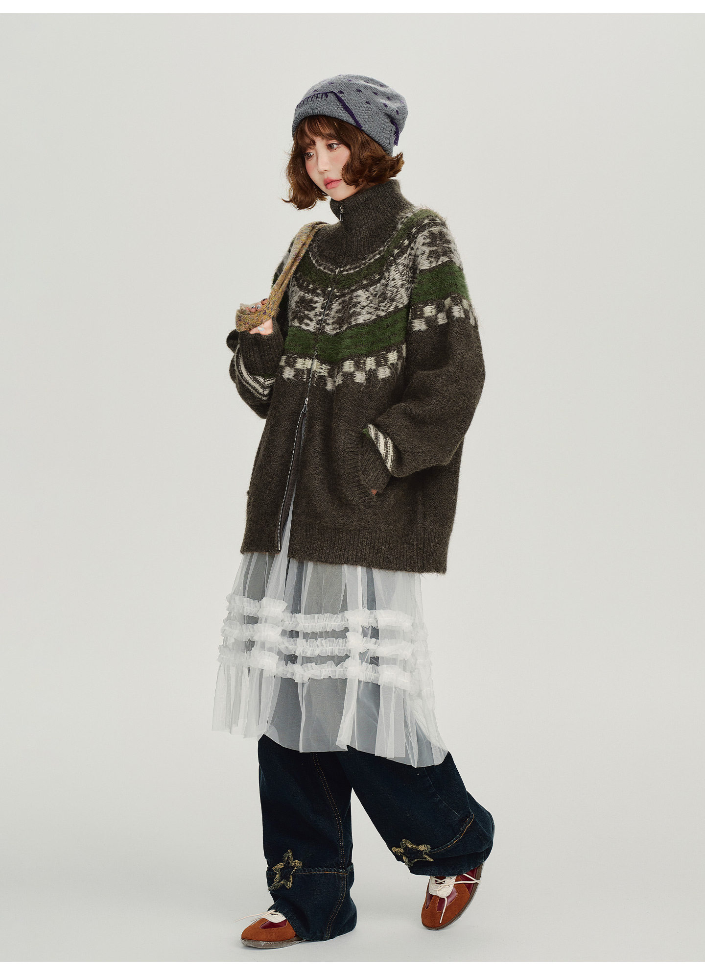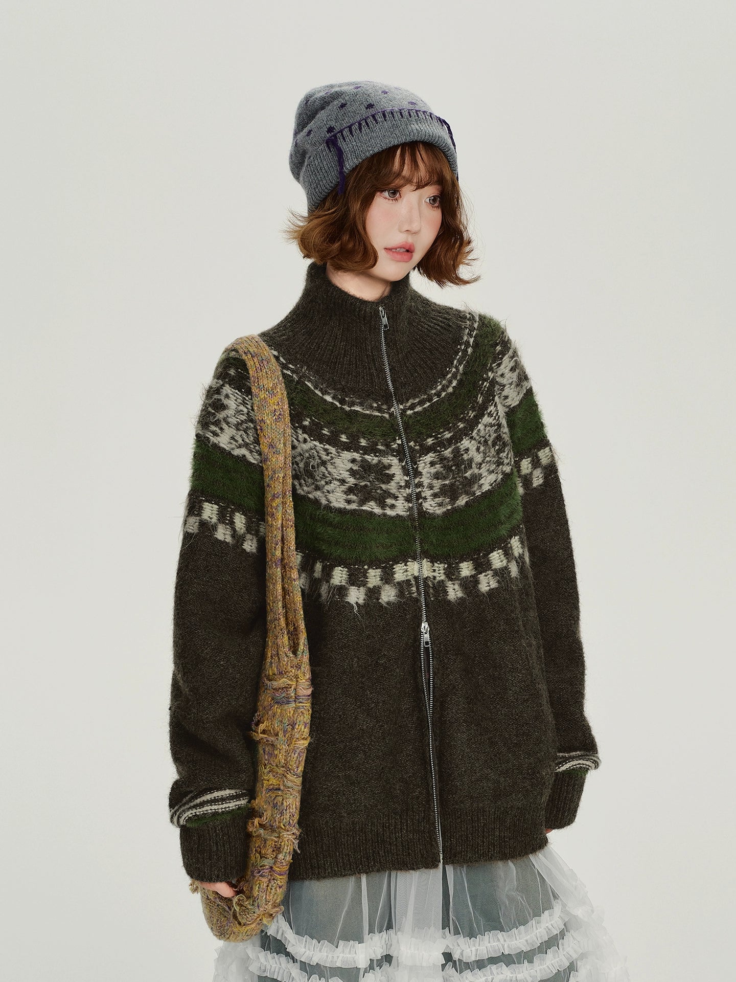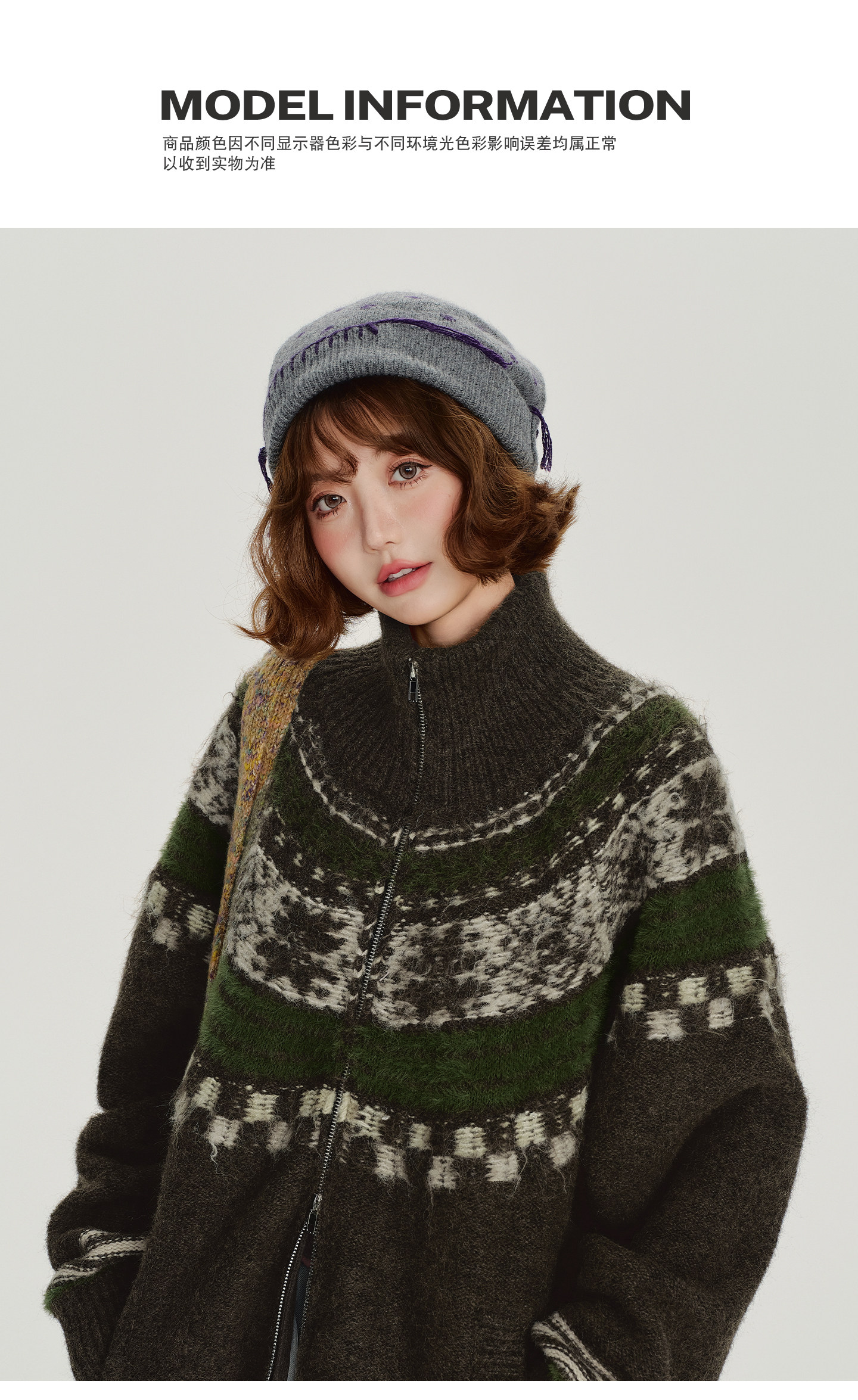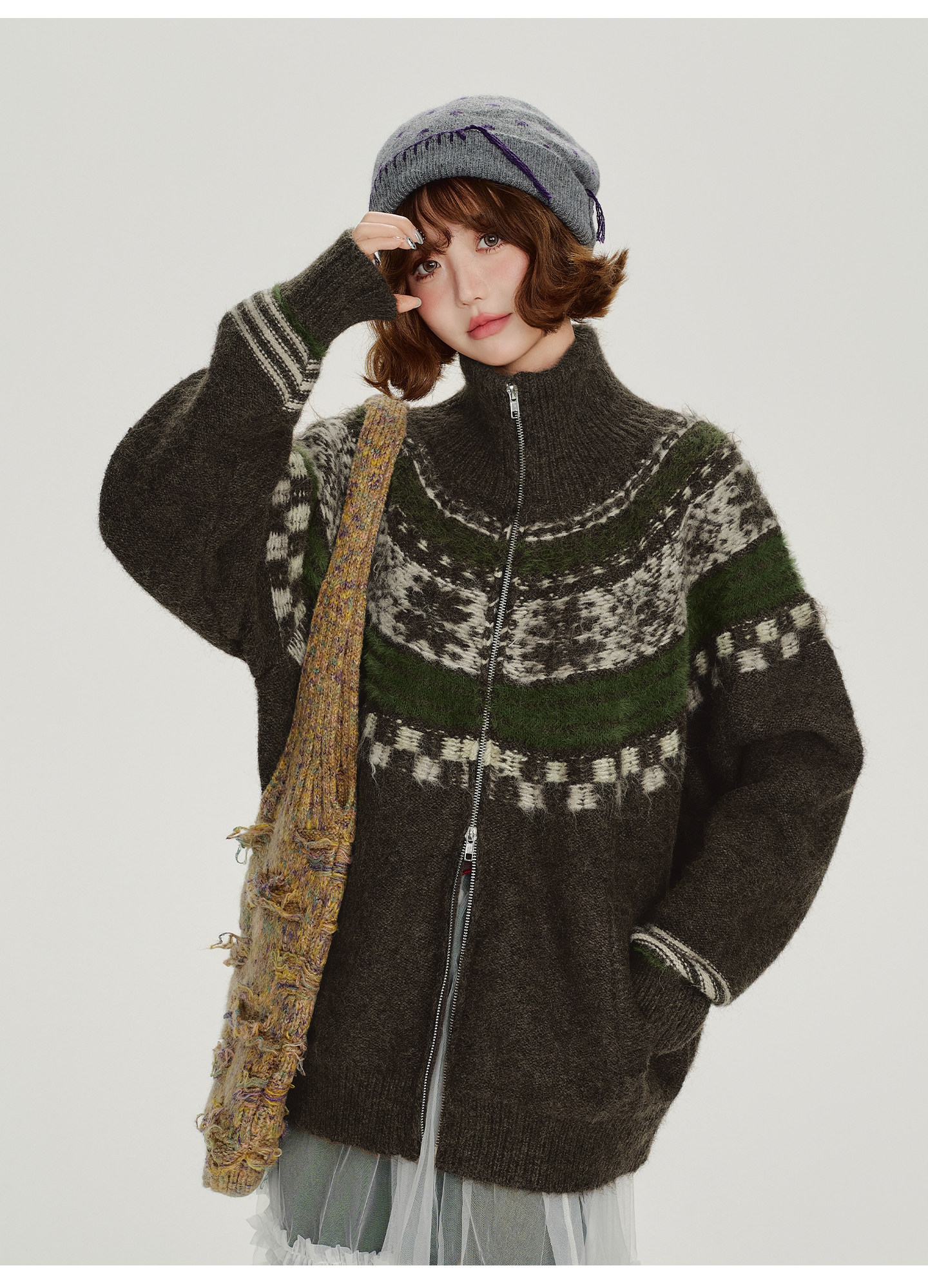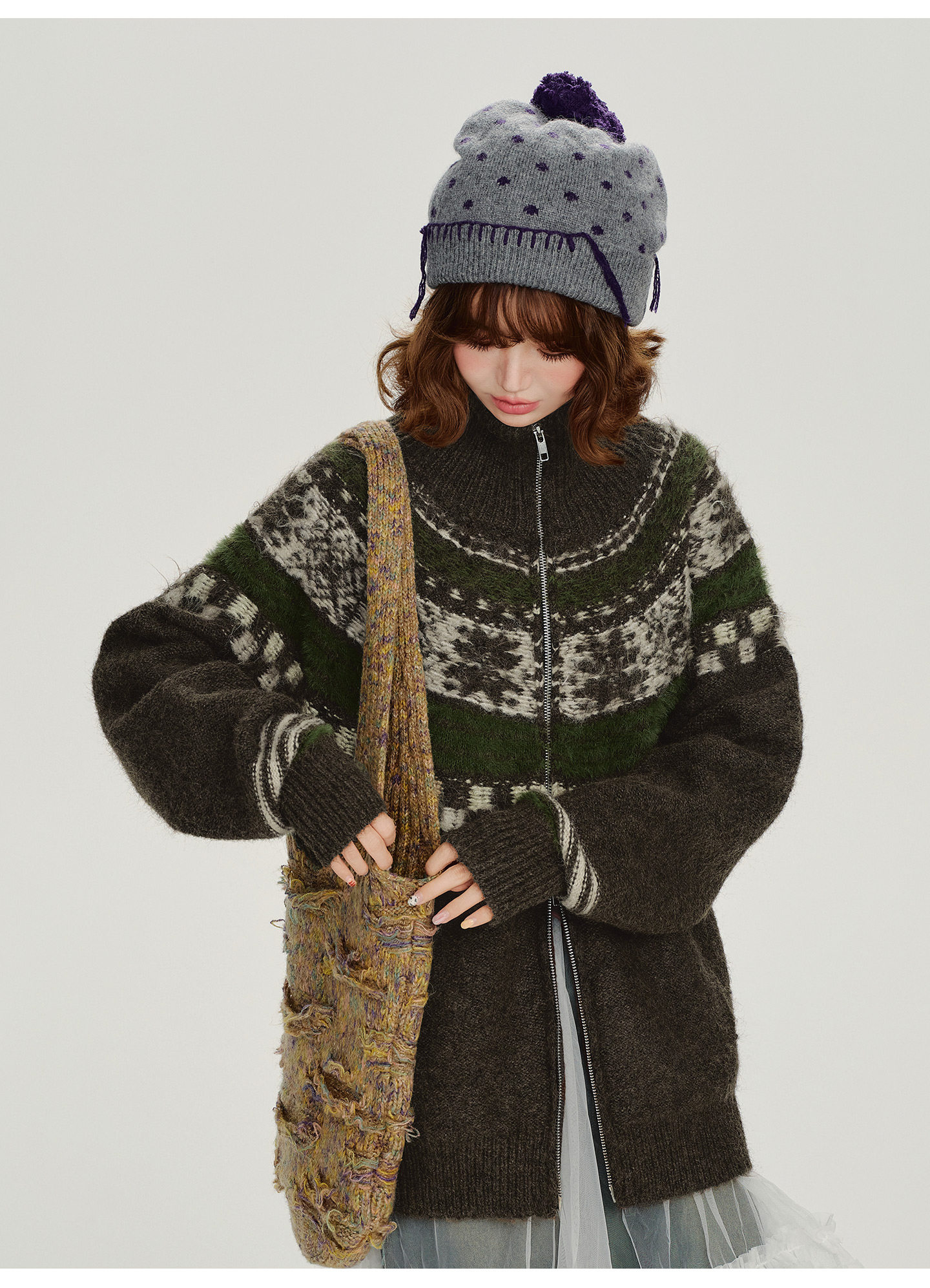 Girlyhalo美式复古费尔岛提花针织外套女冬新款加厚保暖宽松上衣